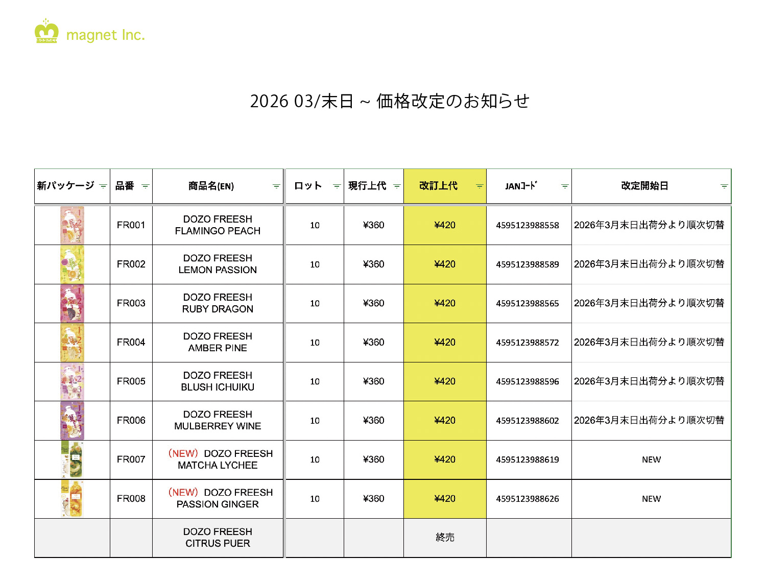 一部商品の上代価格改定を実地致しますことをお知らせします。